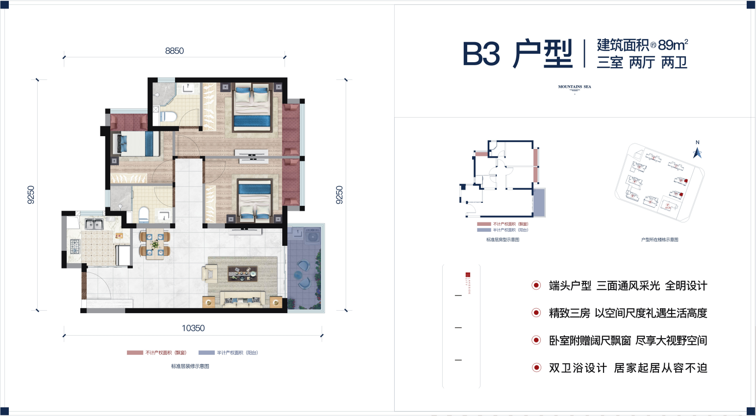端头户型三面通风采光全明设计 精致三房 以生间尺度礼遇生活高度 卧室附赠阔尺飘窗尽享人视野空间 双巴浴设计居家起居从容不迫