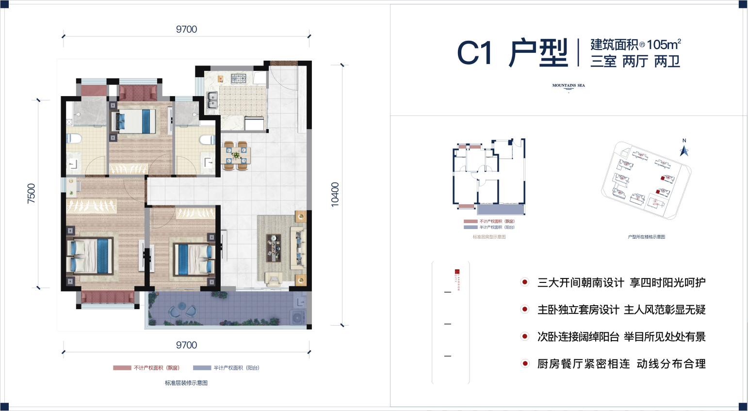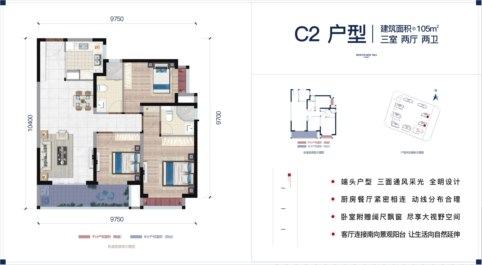 端头户型 三面通风采光 全明设计 厨房餐厅紧密相连 动线分布合理 卧室附赠阔尺飘窗 尽享大视野空间 客厅连接南向景观阳台生活向自然延伸