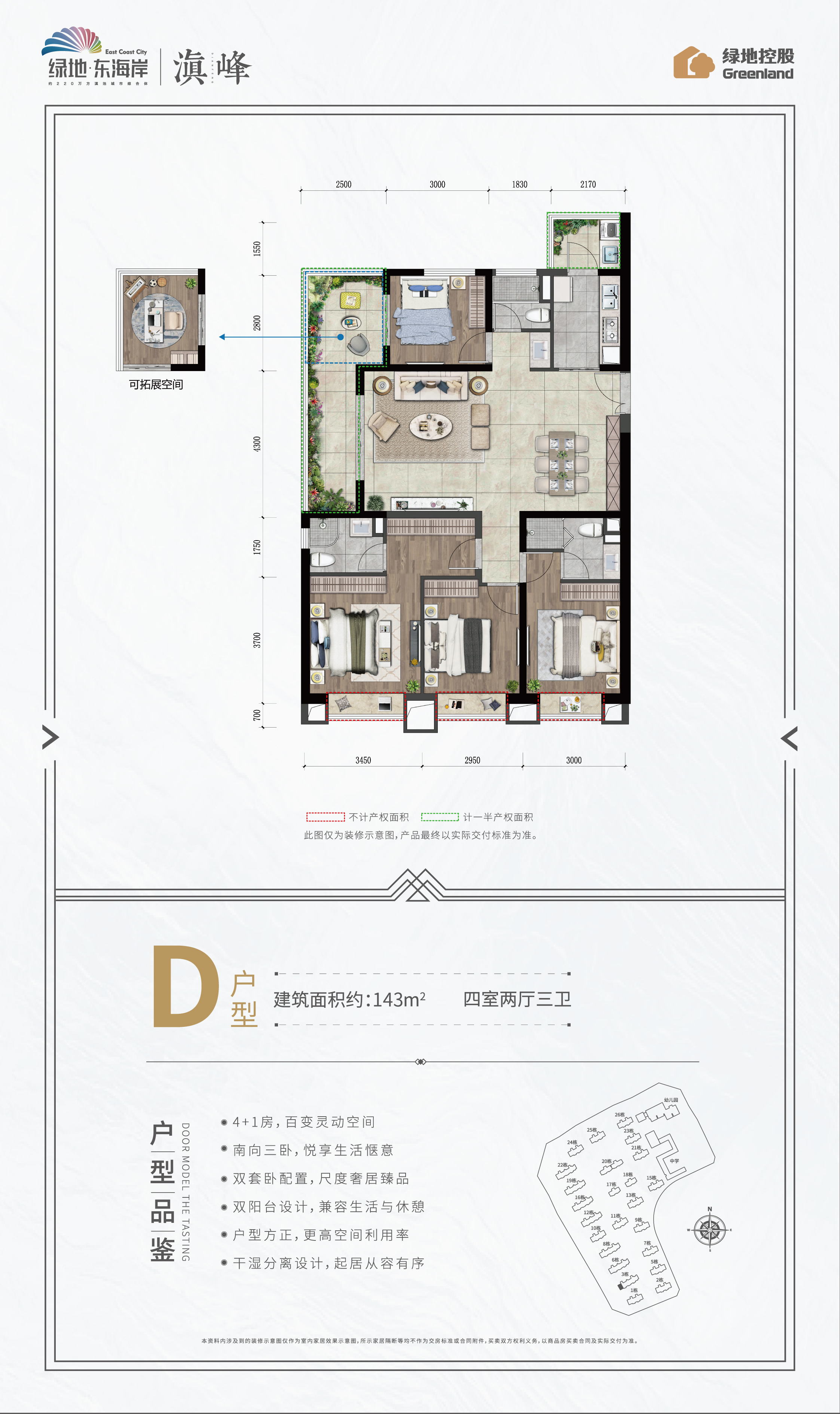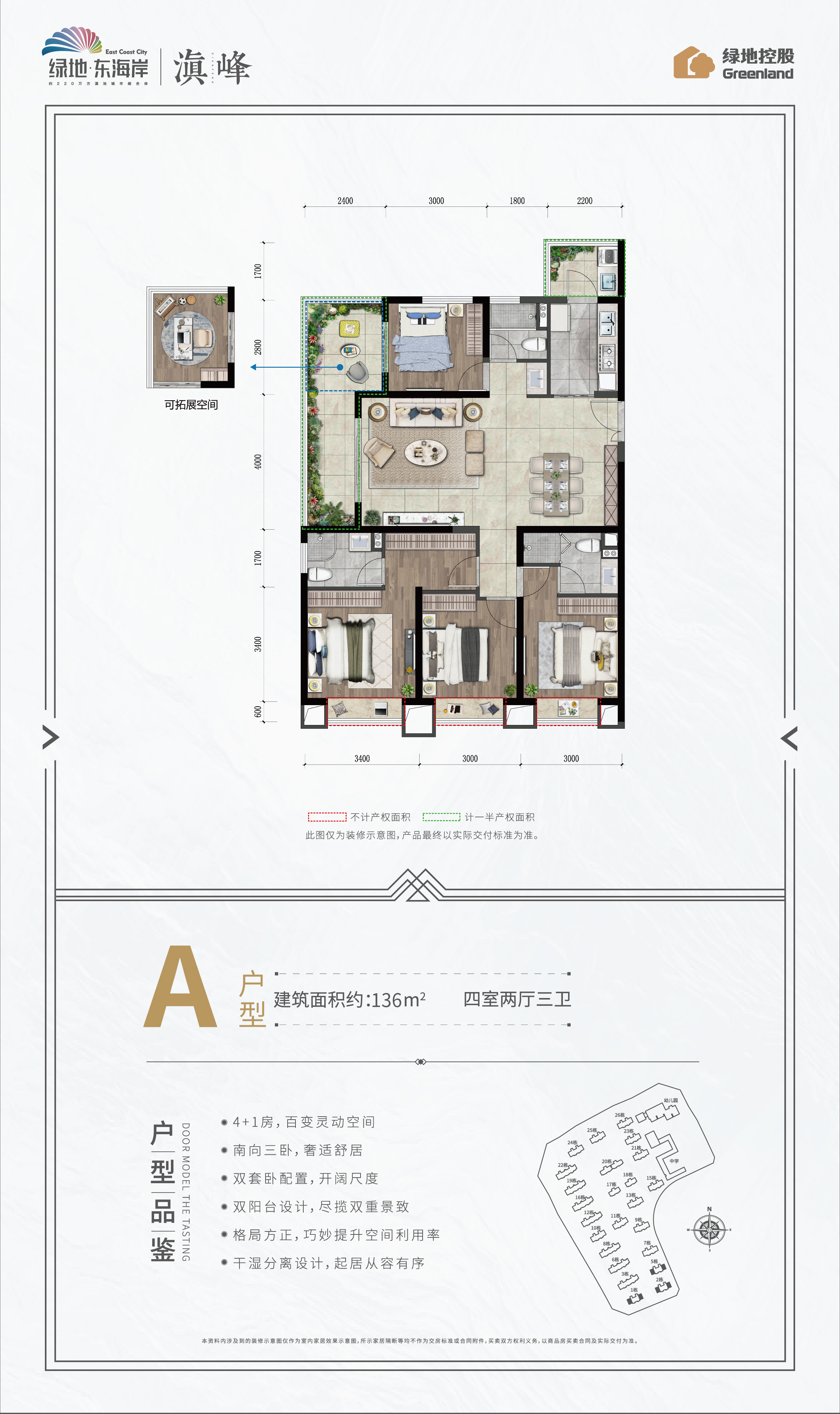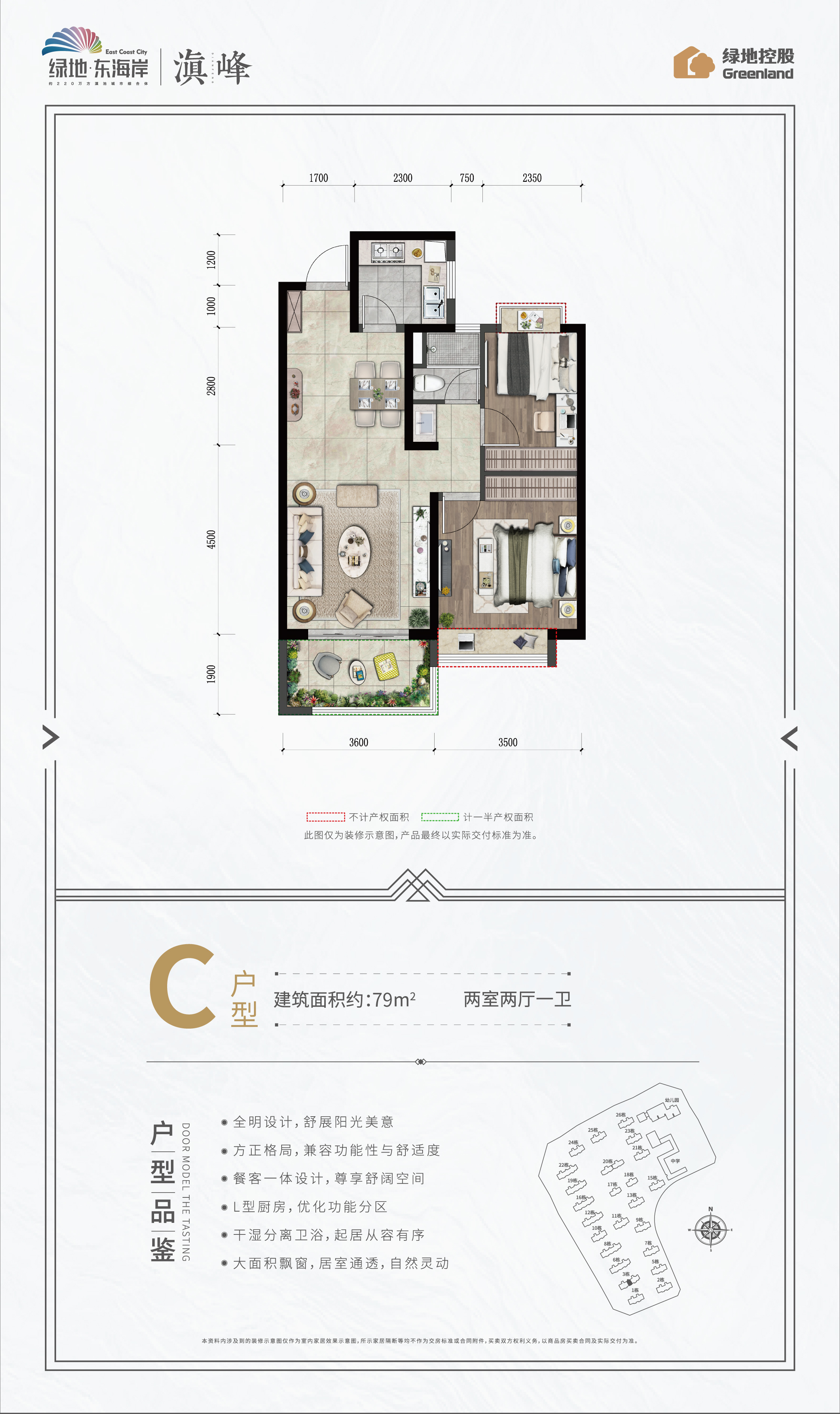绿地东海岸项目总占地面积约716亩,总建筑面积约220万方,滇池畔城市综合体大盘,一期于2017年交付、二期于2019年交付,目前已有3000余户家庭幸福入住。 绿地东海岸占据昆明珍贵不可再生资源,向海拥抱8大湿地公园,向城独揽6大市政公园,距滇池湿地公园约800米,举步可达;三横四纵,立体交通网络,项目距离高铁站仅约8公里,距离长水国际机场约35公里;全龄段教育配套,书香环伺,项目自身规建6所学校(3所幼儿园、2所小学、1所中学),其中昆明市教工一幼、呈贡二幼、师专附小现已开学。 绿地东海岸是目前昆明市场临滇池边唯一的城市综合体项目,项目拥有约35万方商业集群,绿地东海岸购物公园已经运营,汇集沃尔玛、肯德基、橙天国际影城等众多品牌,并引入绿地铂骊酒店、维也纳国际酒店、铂涛酒店集团等国际酒店集群,繁华生活举步即享。 绿地东海岸收官之作——“滇峰”,以居住者的身心感受为原点,回归住宅建造的初心与本愿,项目融合健康与智慧的科技健康宅2.0“四居四全”产品体系、8大全优技术模块、360°全呵护系统,实现绿居、安居、宜居、云居“四局”社区生活,保障全区净化、全区智能、全区安全、全区颐养“四全”健康体系;建筑面积约79-143㎡科技健康宅,南向板式楼,超大阳台,极致采阳,特设可拓展空间,健身房、茶吧、休闲娱乐厅、书房、儿童娱乐等百变空间为生活营造无限可能。